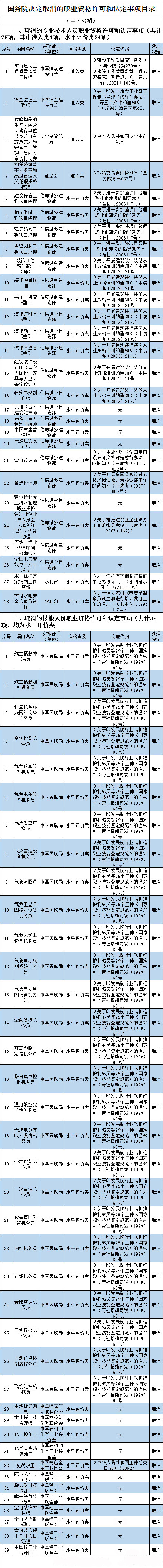河南省教育網(wǎng)訊,近日國務(wù)院發(fā)布國發(fā)國發(fā)〔2015〕11號國務(wù)院關(guān)于取消和調(diào)整一批行政審批項目等事項的決定。文件說,經(jīng)研究論證,國務(wù)院決定,取消和下放90項行政審批項目,取消67項職業(yè)資格許可和認定事項,取消10項評比達標表彰項目,將21項工商登記前置審批事項改為后置審批,保留34項工商登記前置審批事項。同時,建議取消和下放18項依據(jù)有關(guān)法律設(shè)立的行政審批和職業(yè)資格許可認定事項,將5項依據(jù)有關(guān)法律設(shè)立的工商登記前置審批事項改為后置審批,國務(wù)院將依照法定程序提請全國人民代表大會常務(wù)委員會修訂相關(guān)法律規(guī)定。其中取消的職業(yè)資格許可和認定事項,包括礦山建設(shè)工程質(zhì)量監(jiān)督工程師、冶金監(jiān)理工程師、建筑裝飾設(shè)計師、室內(nèi)設(shè)計師、景觀設(shè)計師、氣象填圖員、化工操作工、中國輕工業(yè)設(shè)計師等。如下圖所示:圖片來自網(wǎng)絡(luò)。